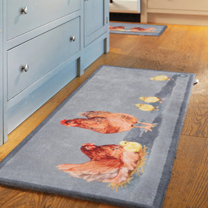 The Mother Hens mat is from our Country collection, this design has a muted blue background with two hand painted chickens nesting with their hatched and unhatched chicks with a dark celadon border. These characterful designs have been created by our designers using inspiration from the great British countryside. We're sure that you'll love this design in your home as much as we do in our own homes.